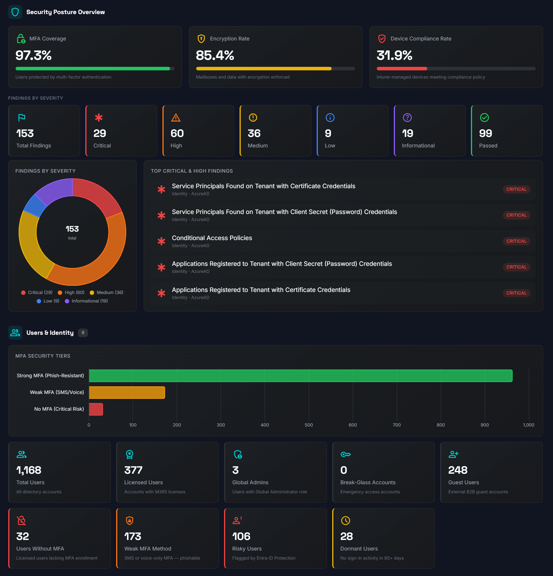 Purpose-built for large organizations. Assess 100,000+ user tenants with optimized performance and parallel processing across 200+ security modules.